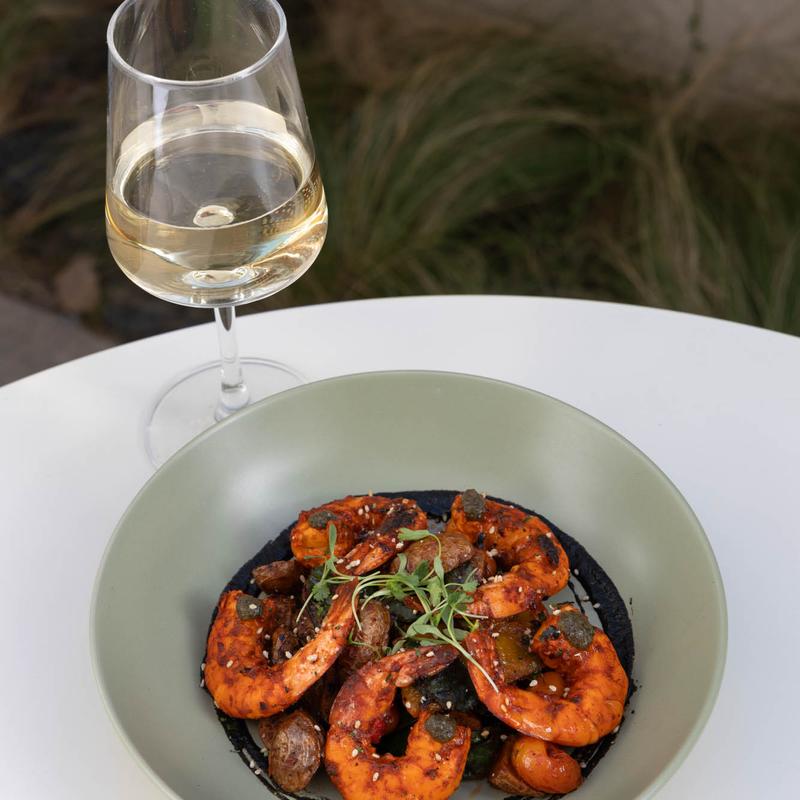 Adobo-marinated Mexican shrimp, blistered sweet peppers, charred cherry tomatoes, crispy potatoes, and wilted chard. Anchored in recado negro finished with a smoky chipotle crema.