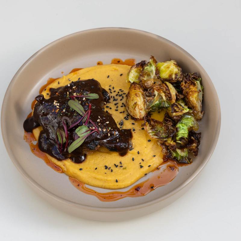 Slow-braised beef over a silky butternut squash puree, with charred brussels sprouts and a rich mole negro salsa.